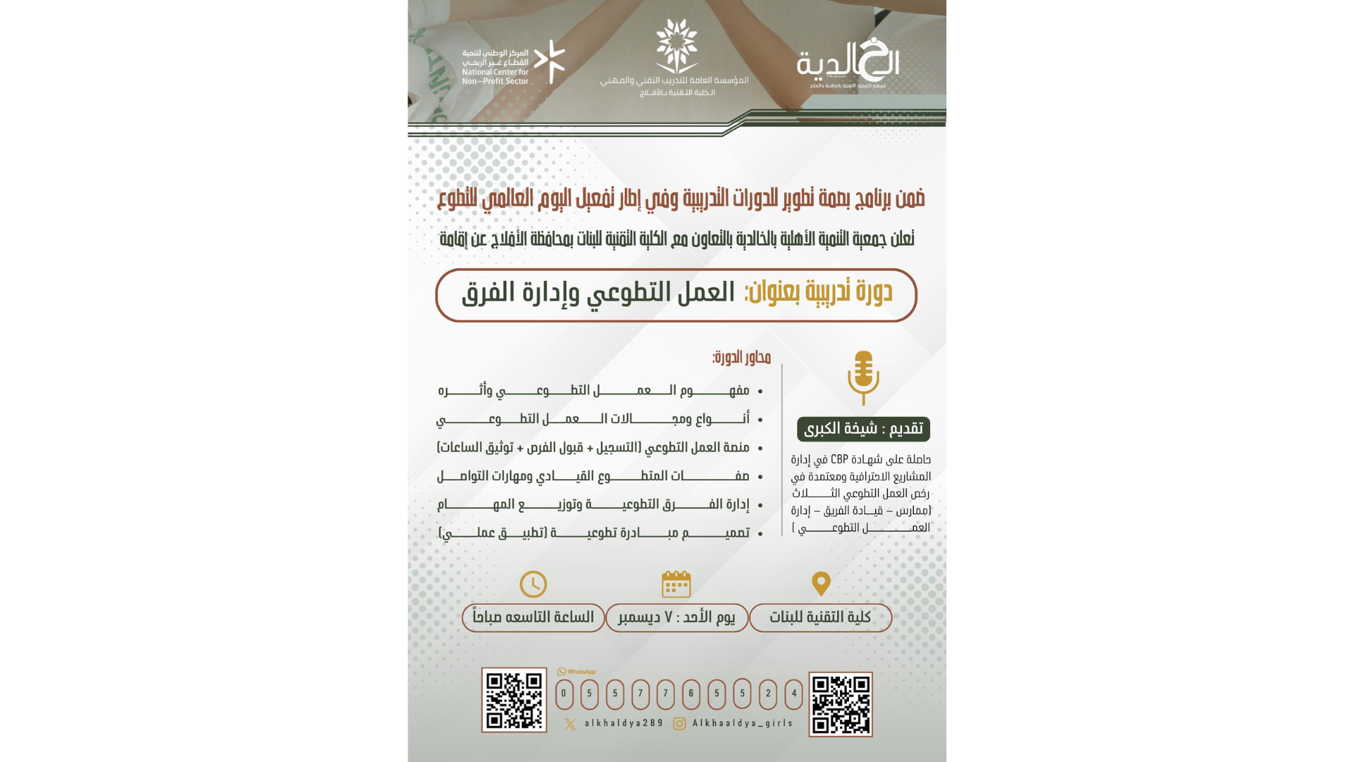 وذلك بالتعاون مع الكلية التقنية للبنات بمحافظة الأفلاج كانت تجربة مليئة بالحماس والعطاء، وهدفها تعزيز ثقافة التطوع وتنمية مهارات إدارة الفرق والمبادرات المجتمعية.